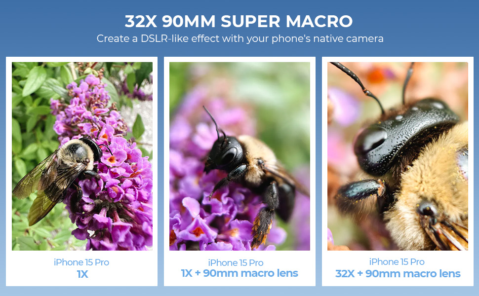 Vores 40-90 mm iPhone makroobjektiv giver mere arbejdsafstand, så du er mindre tilbøjelig til at skræmme bugs væk og mindre tilbøjelig til at have problemer med belysning. Og dens 32X størrelse giver dig mulighed for at få fyldige detaljer og høj klarhed.