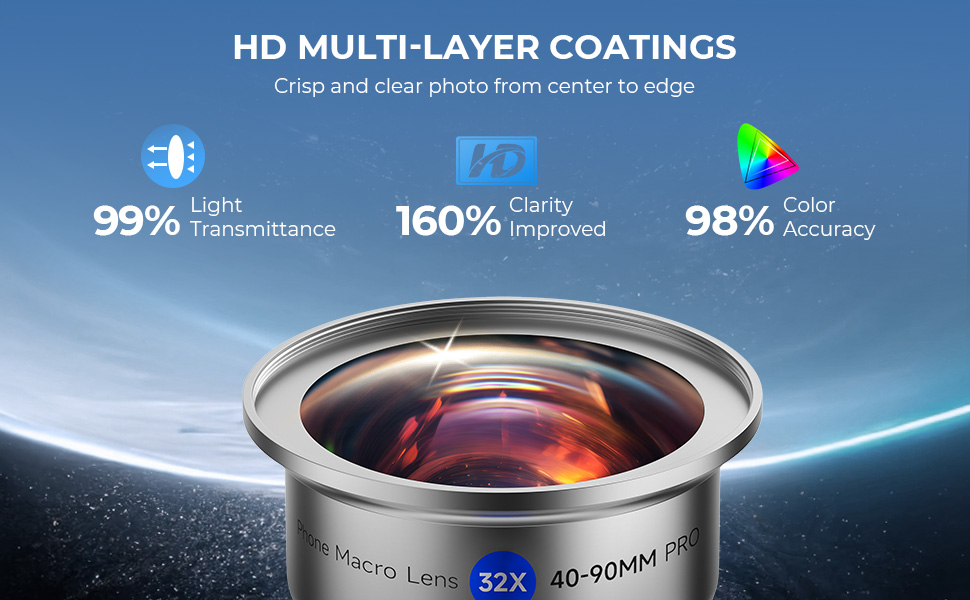 I modsætning til andre objektiver med buede felter, der resulterer i skarpere midtbilleder end dem ved kanterne, har vores makroobjektiver til iPhone og fladt feltdesign, som sikrer skarphed fra kant til kant i alle billeder og forbedrer den samlede billedkvalitetsmarkant. Desuden er linsen belagt med flere lag, hvilket i høj grad forbedrer lystransmission og farvenøjagtighed.