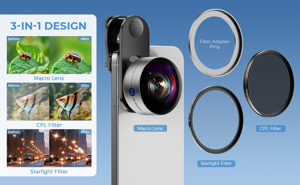 32X makro objektiv til iPhone Android 40-90mm fokusafstand med CPL & Starlight Filter