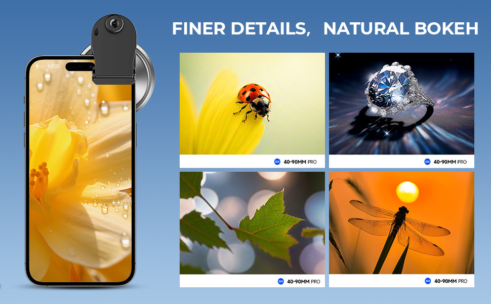 Få professionelle nærbilleder med vores 32X makroobjektiv til iPhone! Dette kompakte clip-on objektiv giver dig mulighed for at optage indviklede detaljer, teksturer og små motiver, som telefonens kamera ikke kan. Opnå skarp fokus med naturlig bokeh for kreative, professionelle billeder.
