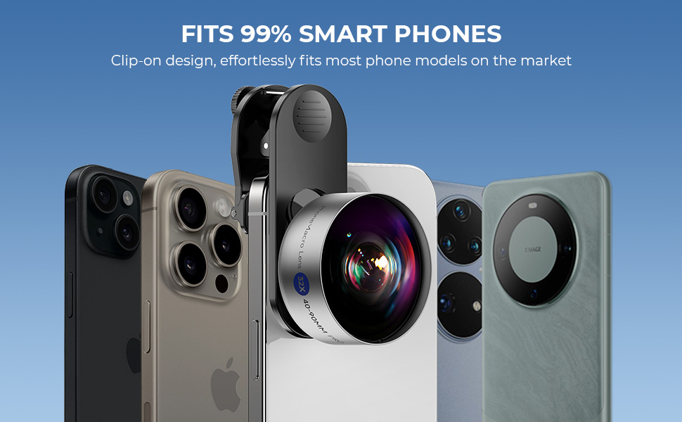 Gælder til næsten alle smartphones, såsom iPhone, Samsung Galaxy og Note, Google Pixel, Huawei, Oneplus osv. Zoom venligst kameraet ud til 1,1x eller mere, hvis vignettering sker. Kompatibel med iPhone 15 Pro Max, 14 Pro Max, 13 Pro Max, 13, Xr, X, XS Max (undtagen vidvinkel, deaktiver venligst makrofunktionen på din telefon). Kompatibel med Samsung Galaxy S23 Ultra og S22 (deaktiver venligst fokus forbedring af din telefon).