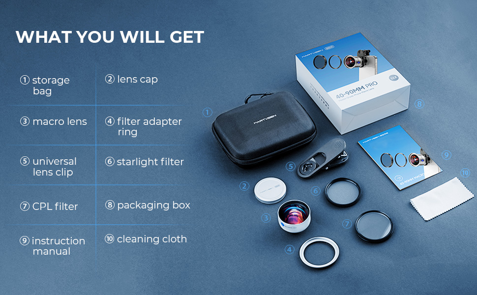 - * Pakken leveres med: Opbevaringspose x 1, 32X makro telefonlinse x 1, objektivklip x 1, stjernelys filter x 1, CPL filter x 1, filteradapterring x 1, objektivdæksel x 1, brugsanvisning x 1, rengøringsklud x 1. Din tilfredshed er vores højeste prioritet , er du velkommen til at kontakte os for eventuelle spørgsmål / problemer, vores dedikerede team vil svare inden for 1 arbejdsdag.