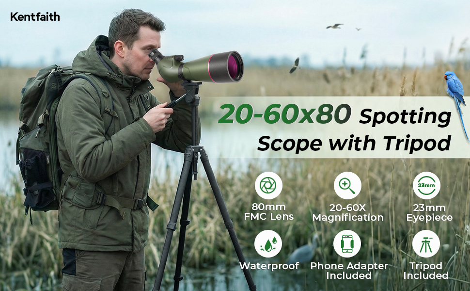 - Opleg verden i imponerende detaljer med Kentfaith 20-60x80 kikkert. Designet med premium 80mm BAK4 fuldt multibeloftet optik, leverer denne kikkert exceptionelt lyse, skarpe og livagtige billeder, selv under svage lysforhold. Den kraftfulde 20x–60x zoom, kombineret med en vejrbestandig og holdbar design, gør den til det perfekte alt-i-ett kit til fugletining, vildtobservation, vandring, bueskydning og astronomi.