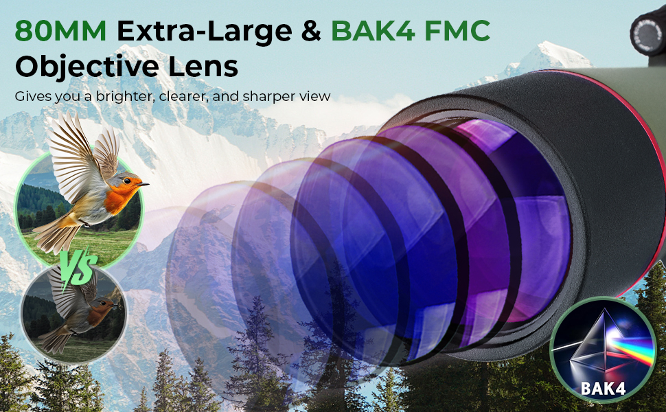 Designet til observation i ethvert lys, er kikkertstativet udstyret med et 80mm FMC stort objektiv med BAK4-prisme for at indfange mere lys og detaljer. Nyd lyse, levende og kontrastrige udsigter fra solopgang til solnedgang.