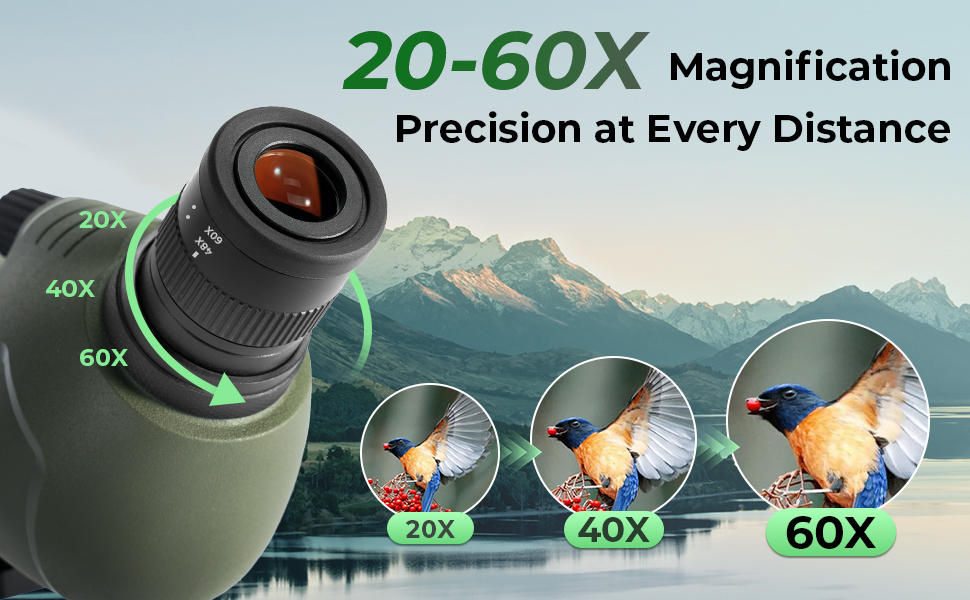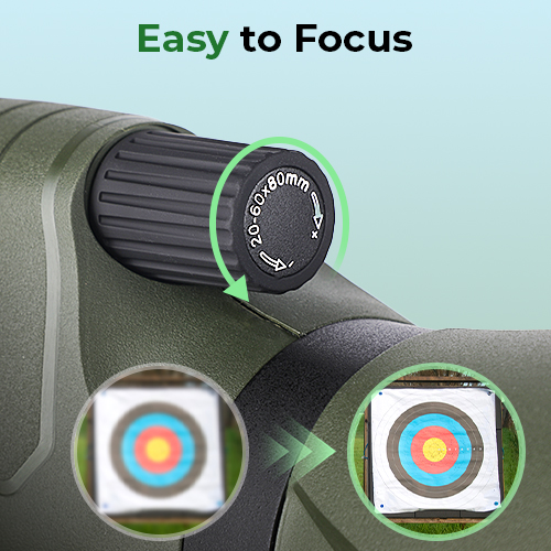 Kikkertsigtet til målskydning har en forstørrelse på 20x til 60x og et responsivt fokussystem, der giver dig præcis kontrol over hvert syn. Du kan nemt zoome ind på fjerne detaljer, fra en fugls fjer til månens kratere – ideel til dyreliv, fuglekigning, jagt, bueskydning og stjernekigning.