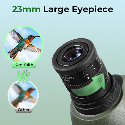 Kikkertens søger har et 23 mm stort okular, som giver et bredere synsfelt og et lysere billede for at reducere øjenbelastning under lange fuglekiggeressioner. Den er lettere at justere, mere tilgivende at bruge og forbliver behagelig selv under langvarig observation.