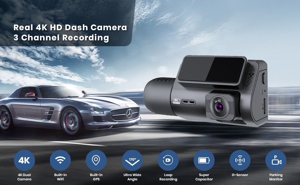 3-kanals 4K Dash Cam, WiFi Dual Dash kamera til biler, 3-kanals Dash Cam med APP, WDR Loop optagelse, GPS, 24 timere parkeringsovervågning, G-Sensor, Natsyn, Nødlås, Support 256GB Max