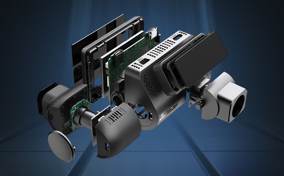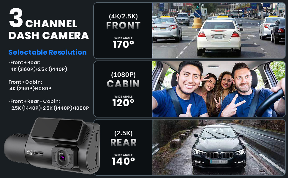 - * Vores bil dual dash kamera er et 3-kanals dash kamera, som understøttes af bedste i klassen Sony IMX335 5MP CMOS sensor, kan samtidig optage 3 vejs videoer, herunder front og bagside og kabine kameraer ved skarp 4K + 2K + 1080P. Den tilbyder også et 170° vidvinkelkamera foran, 120° indvendigt kamera og 140° bagkamera til allround beskyttelse mod potentielle ulykker og erstatningsspørgsmål.