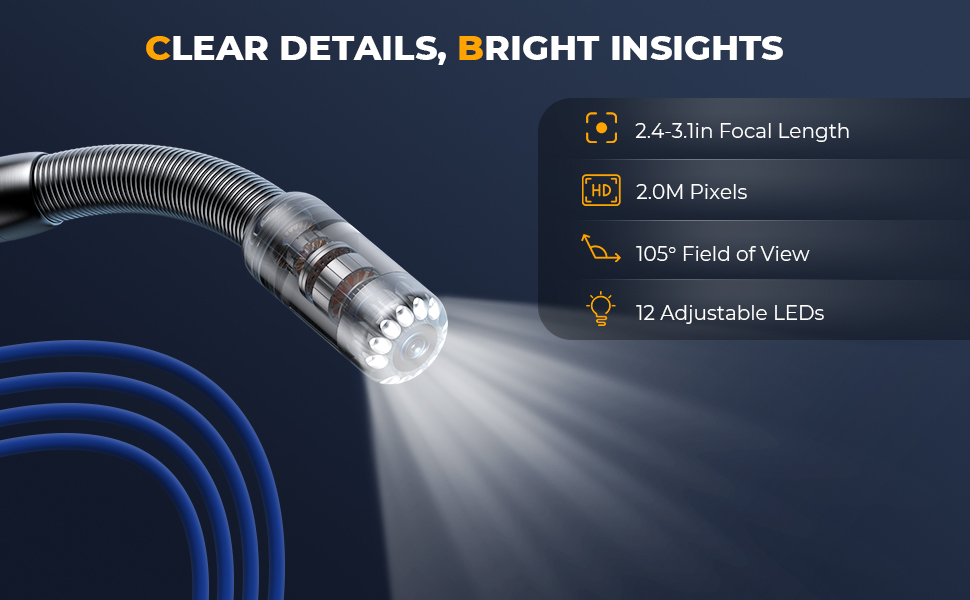 - * 23 mm / 0,9" kamerahovedet er hjemsted for 12 stk lyse lysdioder, du kan nemt justere lysstyrken for at undgå overeksponering eller mørke, optage det bedste billede for en mere præcis diagnose. Vores kloakkamera er designet med et indbygget 10.000 mAh batteri, det holder 7 timer efter en fuld opladning, hvilket eliminerer behovet for yderligere ledninger på jobbet. Du kan altid have ro i sindet, når du er på udendørs inspektioner.