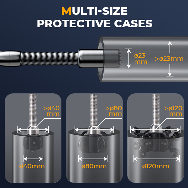 - * Med en sonde i rustfrit stål og et stivt glasfiberkabel er vores inspektionskamera bygget til at modstå hårde forhold. Den er IP68 vandtæt og olietæt, perfekt til undersøiske inspektioner. Fjederkamera sonden fører ubesværet gennem bøjninger, ideel til inspektion af fælder af forskellige former som L, P og S. Plus, vi omfatter 3 kamerabeskyttelsesdæksler (Φ40mm, 80mm og 120mm), der forhindrer skader og sikrer jævn navigation.