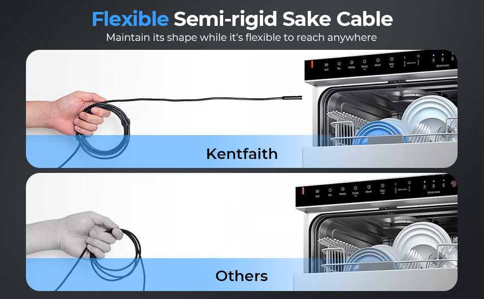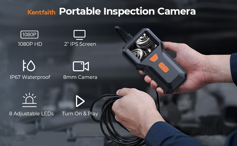 - Det KentFaith hjemmeinspektionskamera er en enkel løsning til hurtig hjemmeinspektion. Ingen Bluetooth, Wi-Fi eller softwaredownloads er nødvendig - bare tænd det og gå! En lys 2" skærm viser 1080p billeder med det samme, og kamerahovedet på 8 mm/0,31" med et stivt kabel gør det nemt at få adgang til snævre steder.