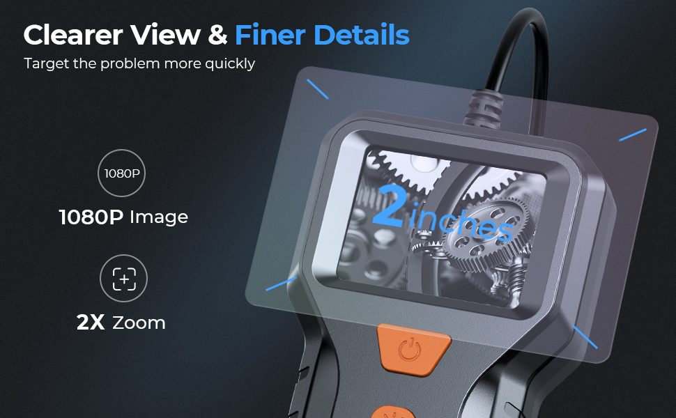 1080p-billederne i højniveau vises på den levende 2" IPS-skærm, og med 3 størrelsesstørrelser (max 2X), tilbyder krystalklare billeder med rige detaljer, så du hurtigt kan identificere og diagnostiske problemer som revner, lækage, form, blokering osv. .