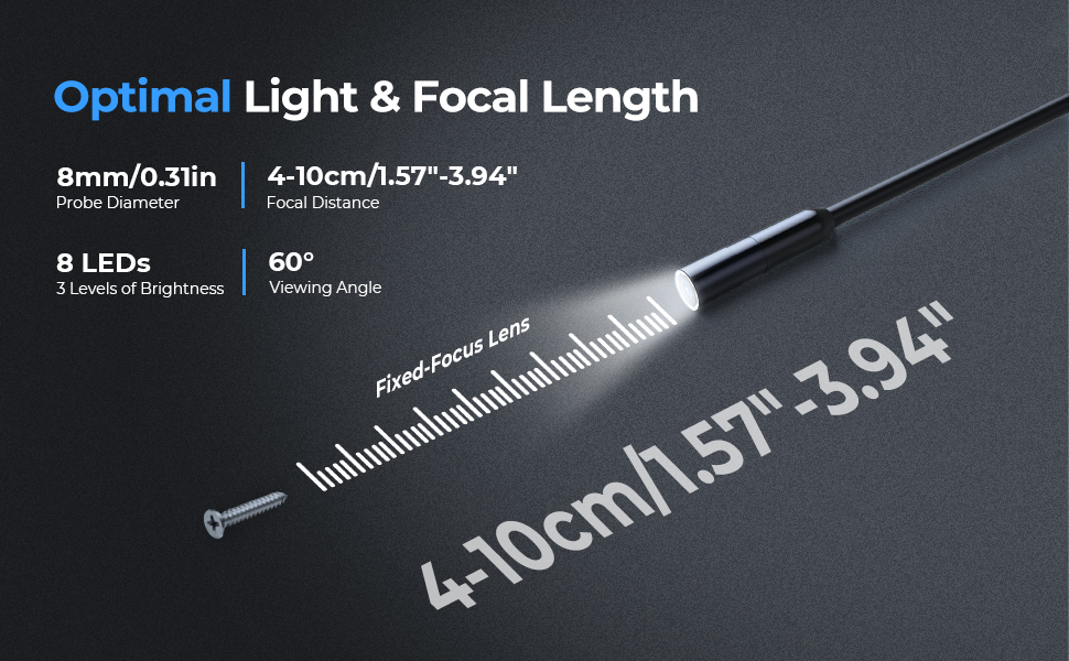8 mm (0,31") kamerahovedet har 8 lys LED'er med 3 lysstyrkeniveauer, der giver klar synlighed i mørke rum. Brændvidden er 4-10 cm, hvilket gør det nemt at fokusere på detaljer fra en 60° bred vinkel for skarpere billeder Du kan nemt spotte træsko i afløb, lokalisere brud i rør, inspicere skader i kanaler og ventilationer, kontrollere fugtskader eller skimmelvækst inde i vægge og afsløre flere skjulte problemer.