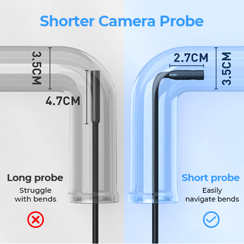 Med kun 2,7 cm langt (sammenlignet med de typiske 4,7 cm) glider vores afløbskamerahoved ubesværet gennem smalle rør og trange rum uden at sidde fast, hvilket giver uovertruffen adgang.