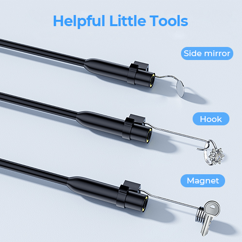Inkluderer udskiftelige redskaber: en krog til at hente genstande, en magnet til at hente små metalgenstande og et spejl til visning rundt om hjørner og i svære at se områder.
