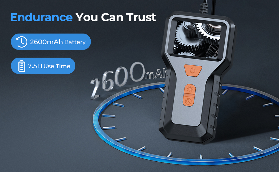 På trods af sin kompakte størrelse pakker vores hjemmeinspektionskamera et stort 2600mAh batteri, som varer i omkring 7,5 timer, du kan tage det udendørs og foretage inspektioner hele dagen lang. Opladning er en leg med USB-C porten via strømbanker, stikkontakter, bilopladere osv.