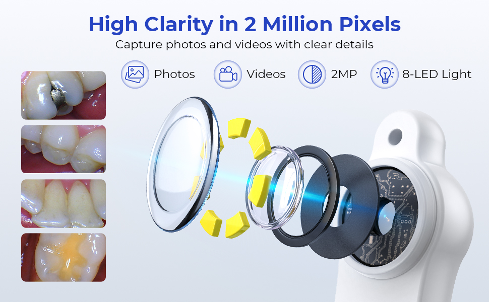 - * Med 2 MP HD-opløsning og 8 LED-lys giver dette smarte intraorale kamera og krystalklart billede af dine tænder og tandkød. Du kan også zoome ind for at få nærmere detaljer, nemt tjekke for små revner, plak ophobning, henfald i tænderne og madaffald – så du kan gribe ind, før mindre problemer bliver til store! (Fokusafstand: 5mm)