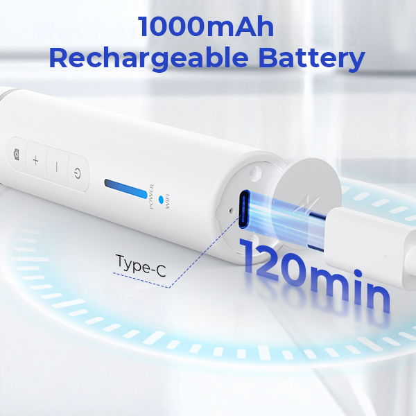 Takket være det genopladelige batteri på 1000 mAh kan du nyde op til 120 minutter kontinuerlig brug, hvilket giver dig masser af tid til at kontrollere hver tand og hvert hjørne, uden at du behøver at stoppe for en genopladning.