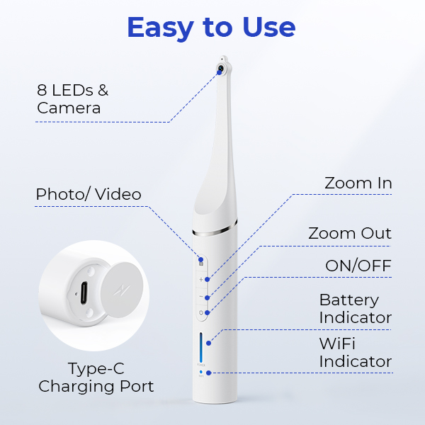 Med sine enkle knapper, klare indikatorer og intuitive telefonbetjeninger er vores trådløse intraorale kamera designet til alle aldre. Uanset om du er et barn, senior eller nogen i mellemtiden, vil du finde det nemt og praktisk at bruge.