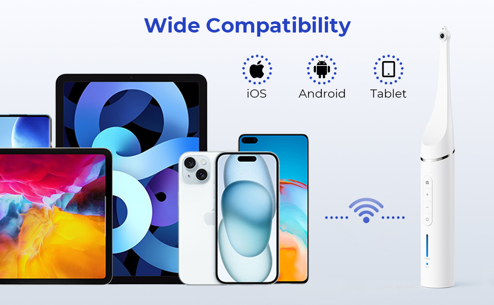 Vores tænderkamera fungerer fejlfrit med både iOS- og Android-enheder, herunder smartphones og tablets. Uanset hvilken enhed du bruger, kan du straks oprette forbindelse og begynde at overvåge din mundsundhed uden besvær.