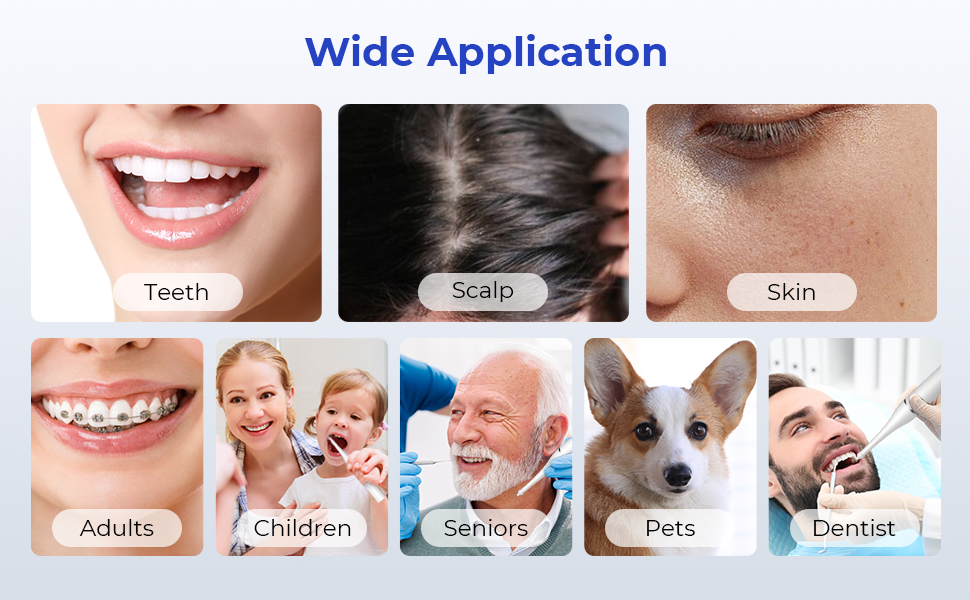 Det trådløse intraorale kamera er et vigtigt værktøj til tandpleje i hjemmet, perfekt til alle aldre – uanset om barn, voksen eller ældre, især dem med bøjle eller tandplejeproblemer. Det er også en nyttig anordning for kæledyrsejere til at inspicere deres pelsede ledsageres ører og mundsundhed. Den kan endda bruges til hud- og hovedbundskontrol, hvilket gør den til en alsidig alt-i-én sundhedsovervågning enhed til daglig brug.