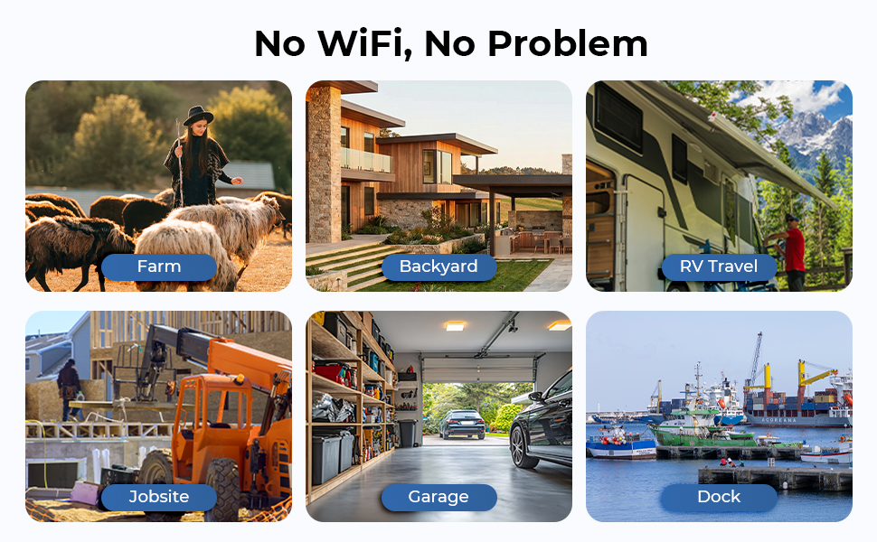 - Perfekt til gårde, ranch, landhjem, byggepladser, garager, campingpladser og alle steder, hvor traditionelle WiFi-kameraer simpelthen ikke kan nå.