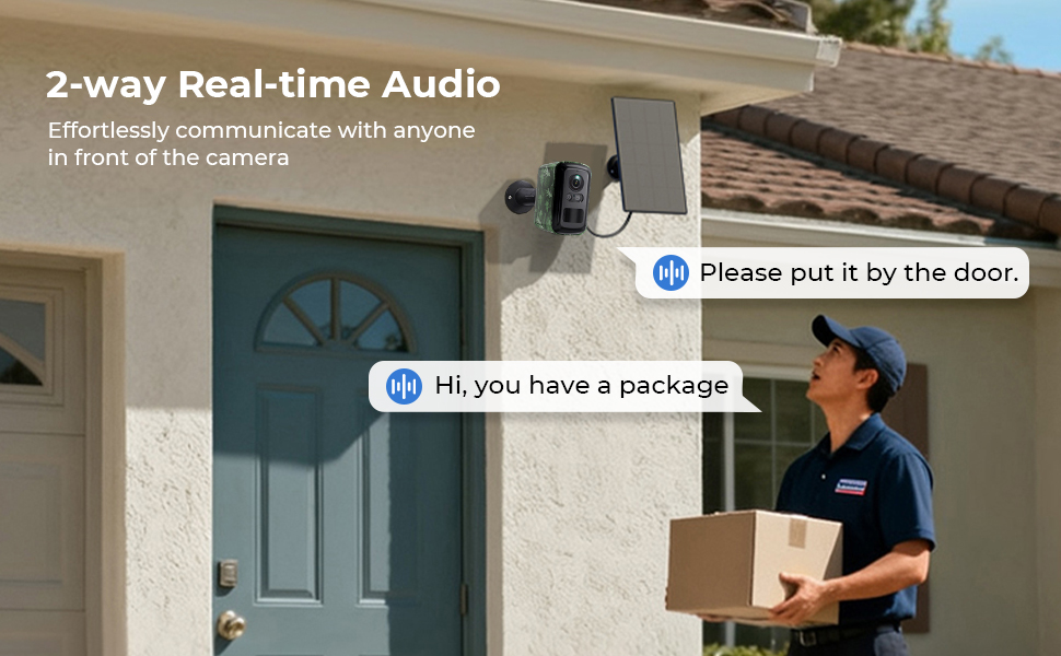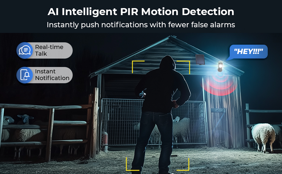 - * Smart Motion Alerts & 2-Way Talk: Få advarsler, der betyder noget. Vores trådløse solcellekamera er udstyret med en smart PIR-sensor, der registrerer bevægelse fra mennesker og dyr og sender en besked direkte til din telefon, mens den ignorerer falske alarmer. Brug den indbyggede mikrofon og højttaler til krystalklar tovejslyd for at hilse på besøgende, give instruktioner eller skræmme ubudne gæster i realtid fra hvor som helst.
