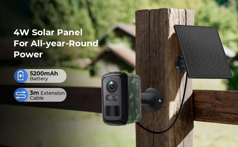 Vores trådløse solcamera kommer med et 4W solpanel og en indbygget 5200mAh genopladelig batteri for at give uafbrudt strøm, hvilket eliminerer behovet for at tage kameraet ned fra væggen for at oplade det. Desuden kan du bruge den 10ft/3m forlængerledning til at finde det perfekte solrige sted og eliminere strømangst for altid.