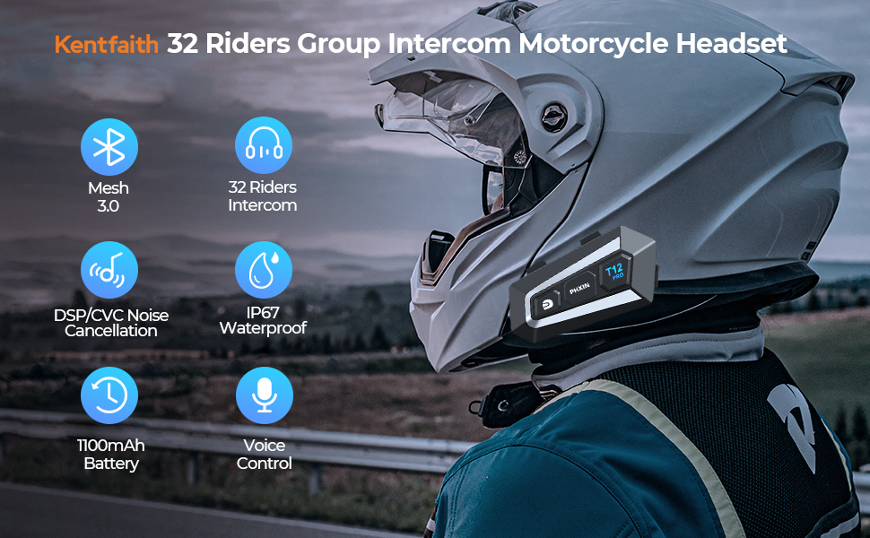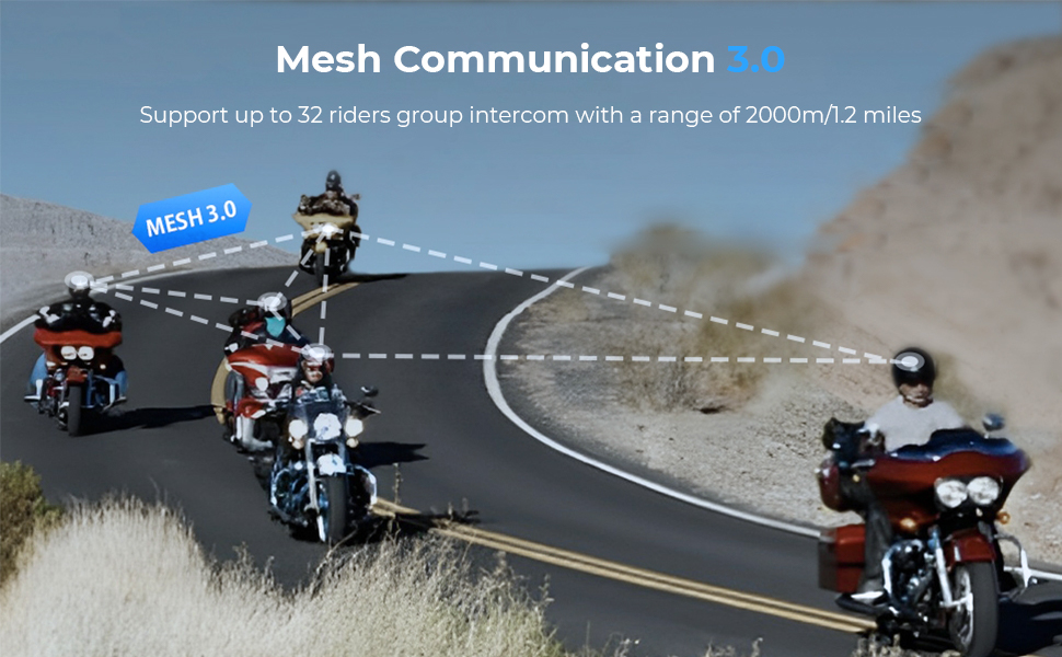 - * Takket være Mesh 3.0 teknologi kan vores hjelm intercom tilsluttes til 32 ryttere inden for en rækkevidde på 2 km/1,2 mile. Nyd problemfri kommunikation på tværs af 10 kanaler uden forsinkelser, så dine gruppechats flyder problemfrit. Vores motorcykel Bluetooth headset er også universelt med ethvert mærkes Bluetooth headset til en 2-rytter intercom via Bluetooth V5.0.