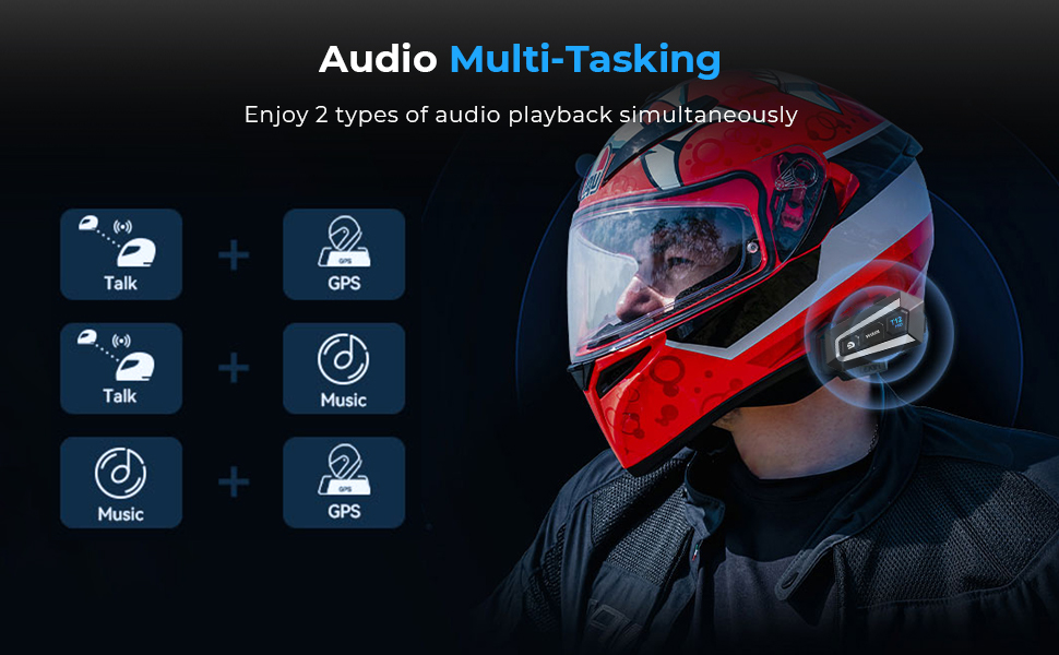 Ja, vores hjelm intercom har en lyd multitasking funktion, du kan lytte 2 typer lydkilde på samme tid, såsom musik og intercom, eller intercom og navigationsprompter.