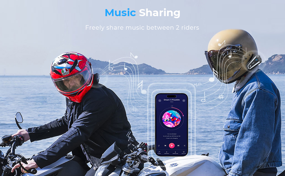 Vores motorcykel Bluetooth intercom giver dig mulighed for at dele den samme musik fra en mobil enhed mellem 2 headsets. Nyd dine foretrukne spor sammen med din medrytter for en mere behagelig rejse!