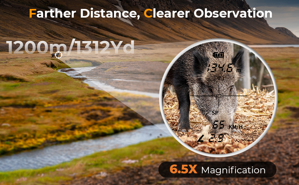 Med op til 6,5 X forstørrelse holder vores jagt range finder dig fokuseret og lader dig komme tættere på dit mål at tage et eneste skridt fremad. Du kan nemt målrette op til 1200m / 1312 yards væk med +/- 0,5Y høj nøjagtighed. Måling af hastighed <0,5s, sørger for, at du kan fokusere på målet på et øjeblik.