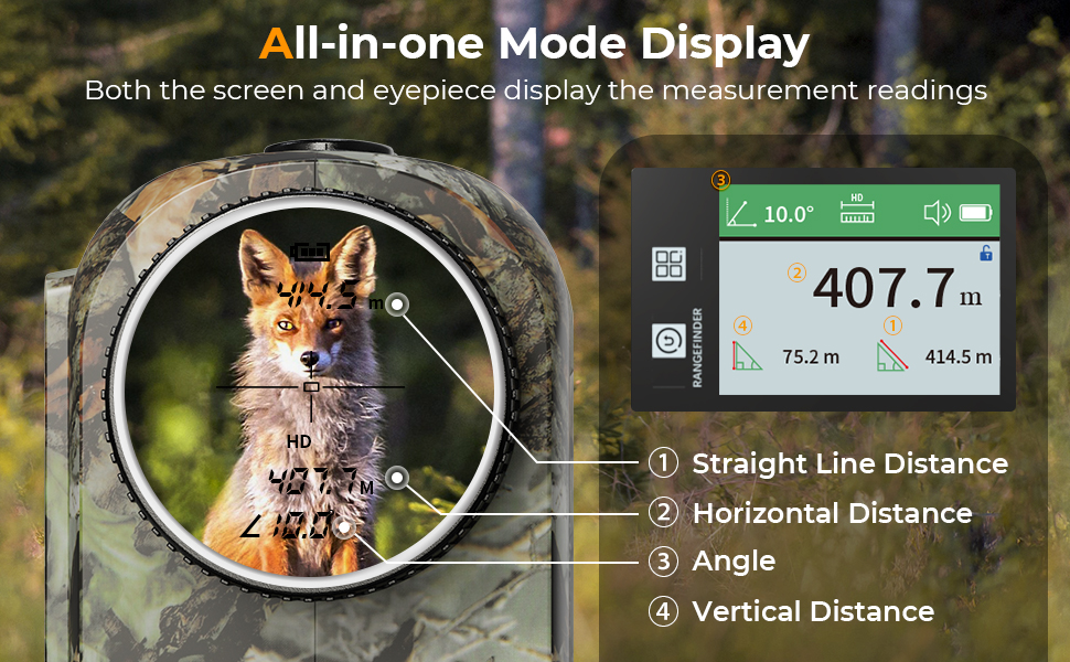 - * 【Ingen missede skud med vinkelkompensation】Sig farvel til gætteri og forbedre dit skydespil! Aktiver hældningsfunktionen, skift til vandret tilstand, og se, hvordan vores jagt afstandsmåler viser den lige linje afstand, vinkel og den korrekte vandrette afstand, der er ideel til både jægere og skytter, hvilket gør det nemt at ringe ind for din riffel eller en bue og få perfekt et perfekt skud hver gang.