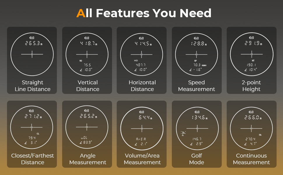 - * 【Alsidige 10 måletilstande】Mål alt, hvor som helst! Med 10 tilstande måler vores genopladelige afstandsmåler ikke kun lige linje og vandret afstand, men måler også hastighed, højde, fjerneste/nærmeste afstand, område/volumen og meget mere. Uanset om du er på jagt, golf, skydning, vandreture eller camping, giver denne lille gadget nøjagtighed og præcision til dine fingerspidser.