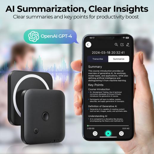 - Efter optagelse konverterer den smart lyd til tekst og laver klare resuméer og nøglepunkter til dig. Det kraftfulde AI-værktøj er din anden hjerne, der sparer dig tid og kræfter, og får din produktivitet til at stige ubesværet!
