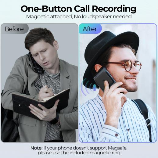 - If your phone doesn't support Magsafe, please stick the included magnetic ring to your phone, and then stick the audio recorder to your phone.