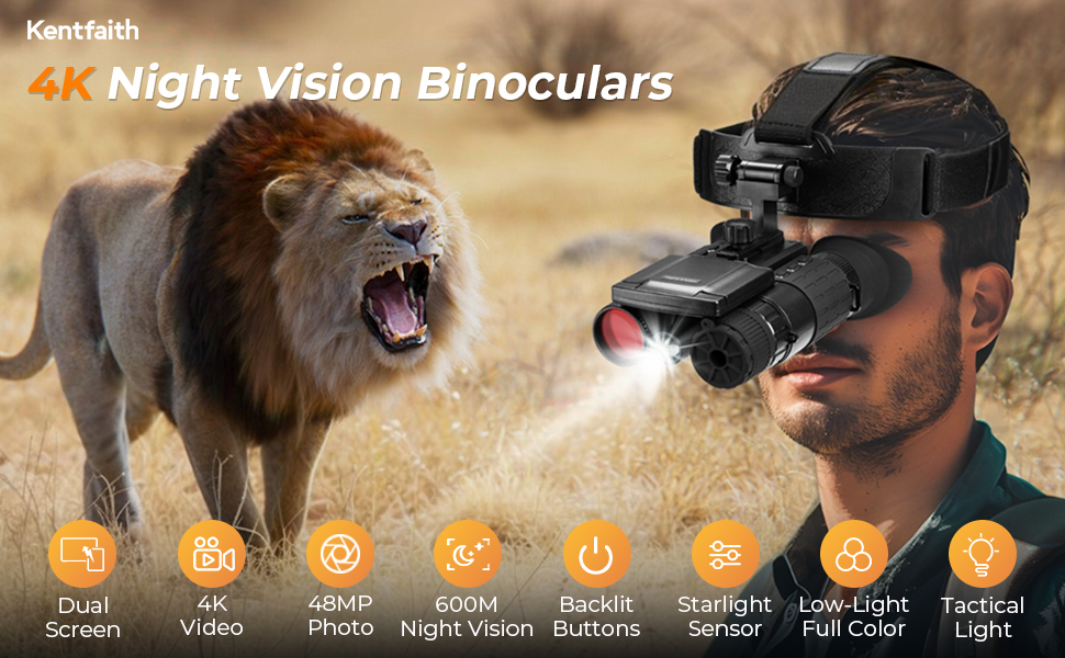 Natkikkert med natbriller, 4K video & 48MP foto, 600m/1968ft IR, stjernelys fuld farve natbriller, dobbeltskærm, lommelygte & baggrundsbelyste knapper, Kentfaith