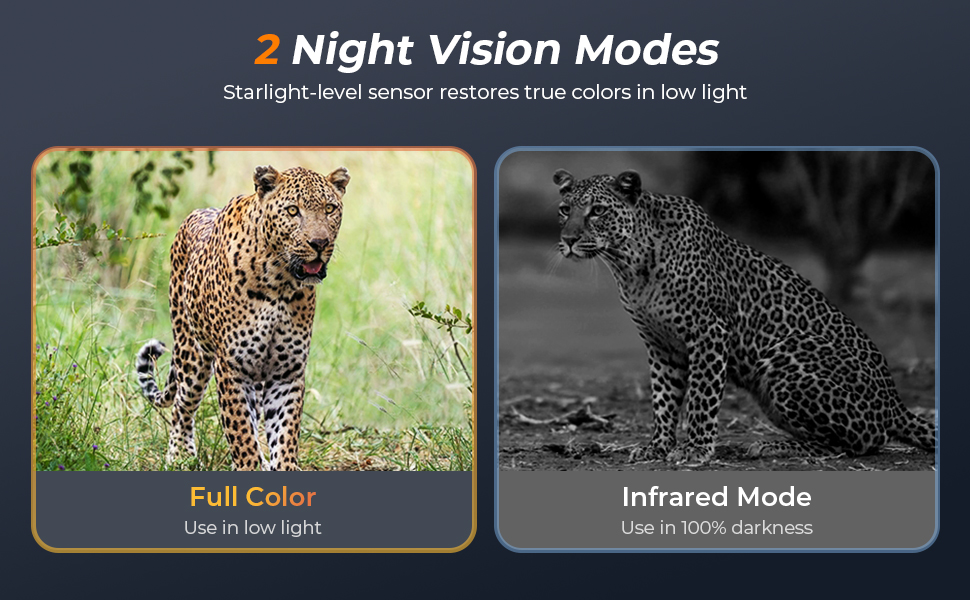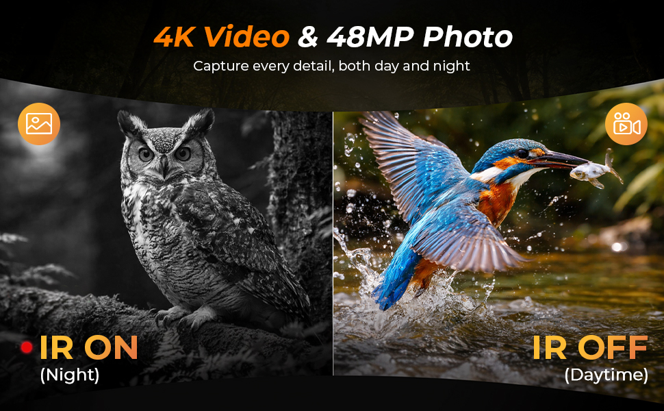 Ultra 4K-video bringer hver bevægelse til live, mens 48MP-fotos fastholder knivskarp detaljerigdom. Fra klart dagslys til totalt mørke bevarer den avancerede stjernelyssensor hver scene – så hvert jagt, hvert spor og hvert møde forbliver lige så levende som det øjeblik, det skete.
