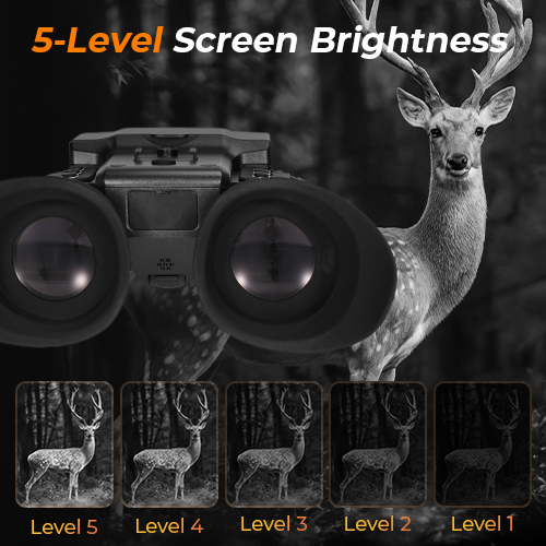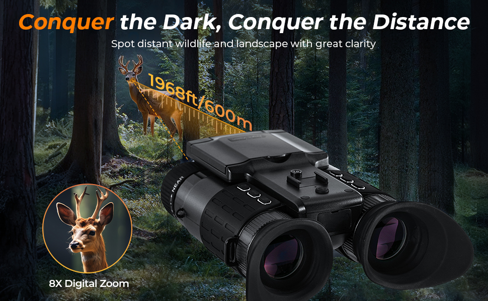 - * 【Se op til 600M / 1.968FT i totalt mørke】Drevet af en 3W 850nm infrarød belysning med 3 justerbare IR-niveauer, leverer disse IR-natbriller krystalklar synlighed selv i fuldstændig mørke. Opdag nemt vildt, overvåg din ejendom eller spil op til 1.968 ft (600 m) væk. Med 8X digital zoom kommer hver fjern detalje skarpt i syne.