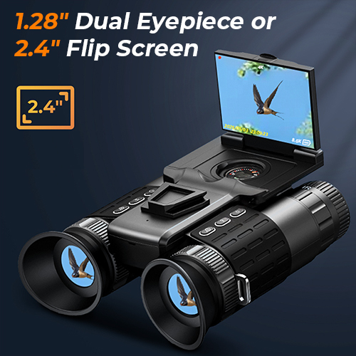 Tilpas dig øjeblikkeligt til enhver natscenario med disse 4K-natbriller. Brug 1.28" dobbelt okularer til en fordybende, lysblokerende stealth-udsigt, eller fold den 2.4" HD-skærm ud for en mere behagelig, delbar oplevelse. Tryk blot længe på IR-knappen for at skifte.