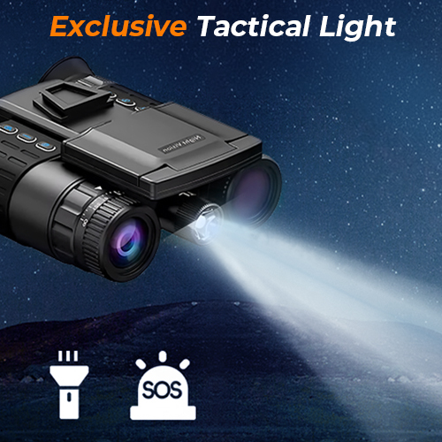 - * 【Indbygget taktisk lys & baggrundsbelyste knapper】 Denne natbrille er altid klar til mission. Brug det indbyggede taktiske lys til at belyse din vej eller skift til strobe til nødsignalering. Baggrundsbelyste knapper sikrer præcis betjening i fuldstændig mørke—og når diskretion er afgørende, skal du blot slukke lyset og forblive uopdaget.