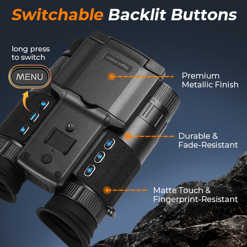 Betjen dine 4K natbriller med nattesyn uden besvær, selv i fuldstændig mørke. Oplyste knapper guider hver tryk med præcision. Har du brug for stealth? Langtryk for at slukke baggrundsbelysningen og forblive fuldstændig uset.