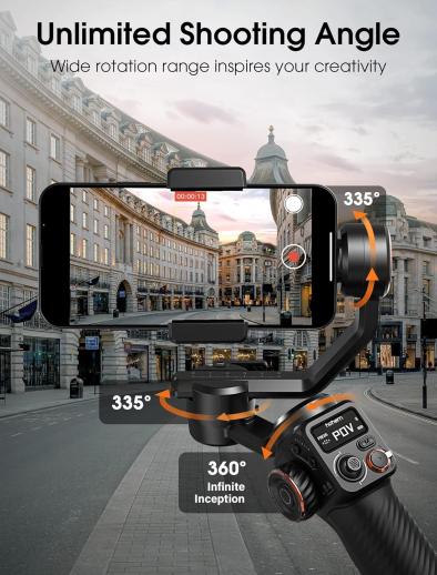 - * 【Ubegrænset optagelsesvinkel】Denne telefon stabilisator lader dig rotere din telefon 360 ° lodret og uendeligt, bryde fri for app begrænsninger. Med et massivt rotationsområde på 335° kan du optage dynamiske billeder fra enhver vinkel, hvilket sikrer perfekt indramning hver gang. Opret fantastiske, filmiske videoer med iPhone gimbal - der er ingen grænse for din kreativitet!