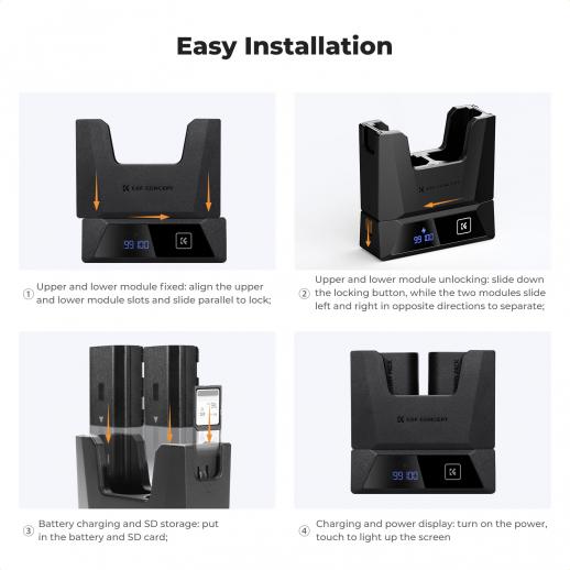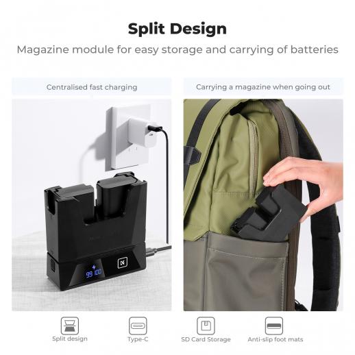 - * Kompakt og modulært design – K&F Concept NP-FZ100 batterioplader er aftagelig og fungerer som praktisk opbevaring til dine batterier, perfekt til rejser og vlogging.