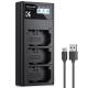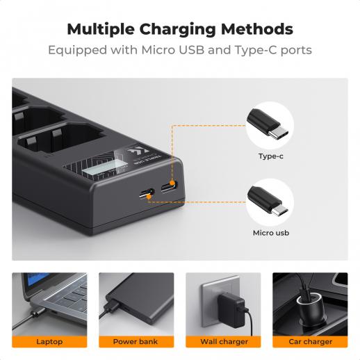 - * 【Flere opladningsmuligheder】 Hurtigopladeren med 3 pladser kan oplade 3 batterier samtidigt eller separat via den bærbare computer, pc, biloplader, vægoplader eller powerbank.