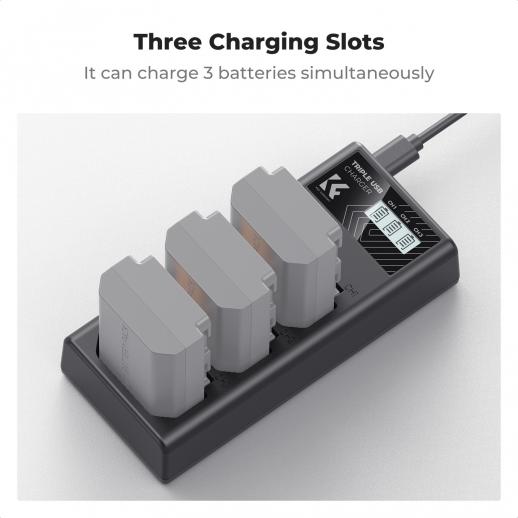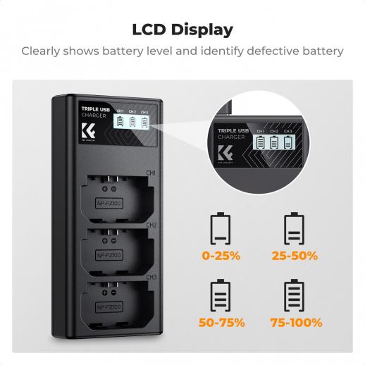 K&F Concept NP-FZ100 oplader, 3-slot A7iii batterioplader med LCD-skærm til Sony A7iii A7iv A7Rv A6700 A6600 A9 A1 FX3 FX30 ZV-E1 kameraer