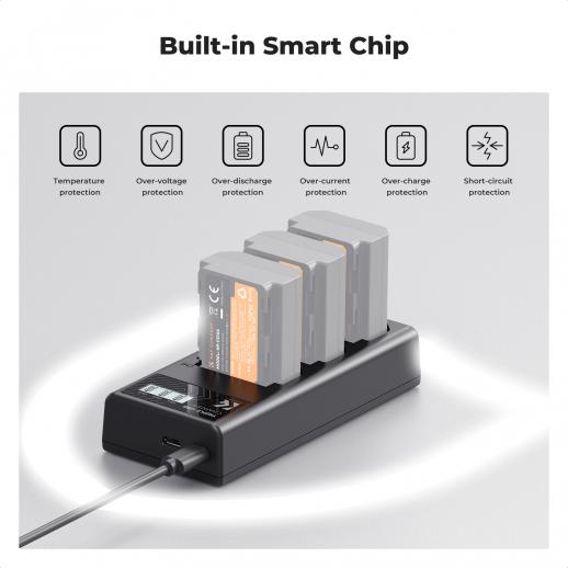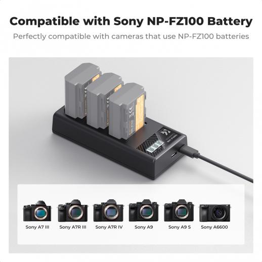- * 【3-slot NP-FZ100 batterioplader】 NP-FZ100 batterihurtigopladeren er udstyret med micro-USB og Type-C dobbelt interface, der effektivt oplader 3 stk A7iv batterier samtidigt eller uafhængigt. Bemærk: Kun Type-C kabel er inkluderet.