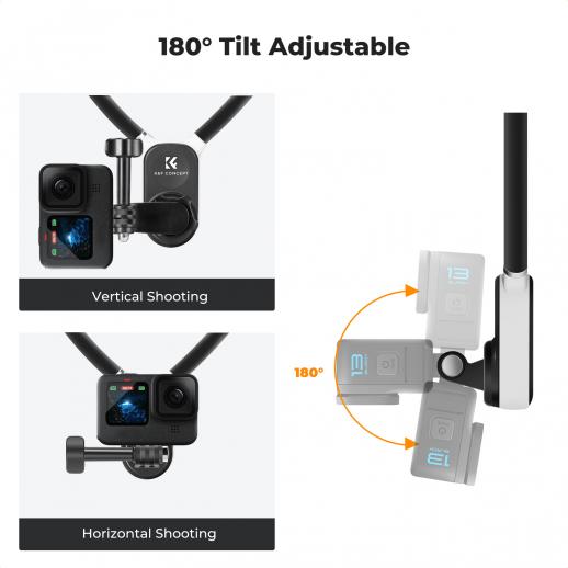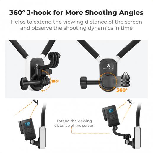 - * 【Multi-vinkeljustering】 Med en 360° roterende J-krog kan du ændre actionkameraets position til lodret eller vandret optagelse. actionkamerabeslaget kan vippes 180° for fleksibel vinkeljustering.