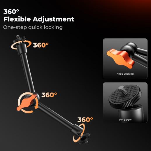 - * [360° JUSTERBAR MAGIC ARM] - Magic Arm-kameramontering 360° dobbelt kuglehoveddesign for bedre fleksibilitet, nem justering af enheden i den ideelle position. Begge ender af Magic Arm er udstyret med 1/4" skruer til fastgørelse af kamera, blitz, mikrofon, webcam, skærm og actionkamera.