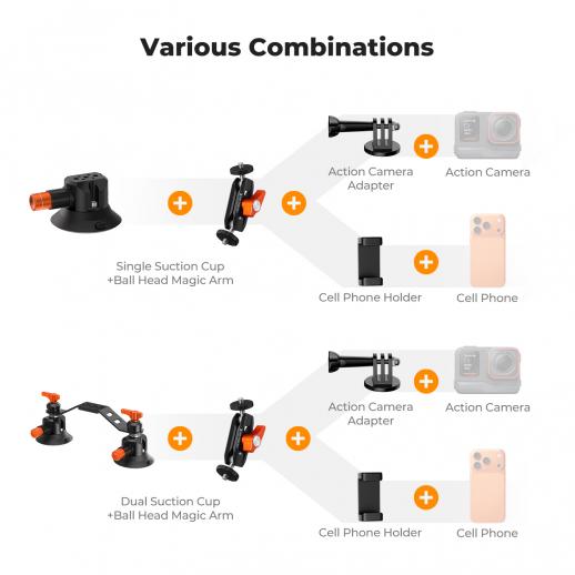 - * 【Justerbar optagelsesvinkel】 - Sugekopforbindelsen tilbyder flere udvidelsesgrænseflader med et 1/4-tommer skruehul og 3/8-tommer gevindhul. Sugekoppens kuglehoved muliggør 15° mikrojustering til fastgørelse på let buede overflader. Den dobbelte kuglearm muliggør mere fleksible optagelsesvinkler.